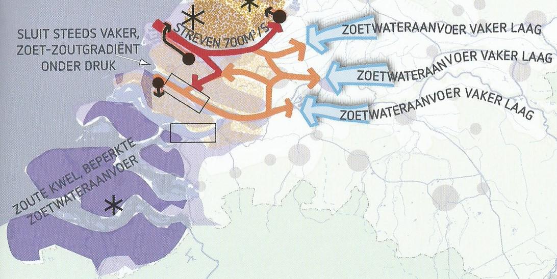 Er is door het jaar heen meer dan voldoende zoet water beschikbaar om de Zeeuwse wateren te verzoeten. Andersom, in droge tijden met weinig rivieraanvoer, is de zoetwatervoorraad te liften door tijdelijk zout water aan de bodem binnen te laten.