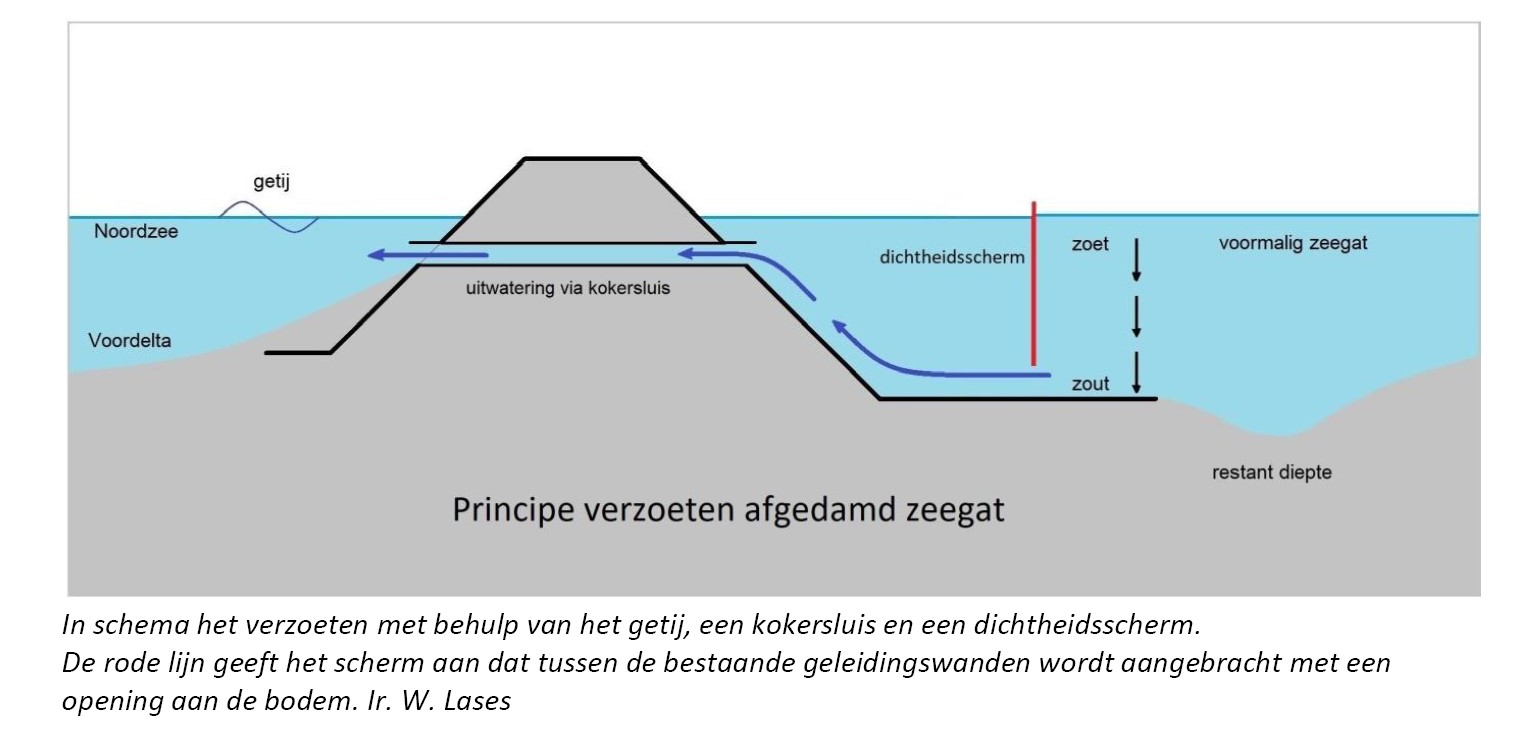 In de zeventiger jaren werd bij de Deltadienst de verzoeting van zowel de Grevelingen als de Oosterschelde volledig voorbereid. De zoute wateren kunnen in enkele maanden worden verzoet (zie illustratie). De zwaardere zoute onderlaag wordt eenvoudig bij eb naar zee geheveld in perioden dat er voldoende rivierwater beschikbaar is. Zo verdringt het zoete water het zout zonder dat er sprake is van menging.