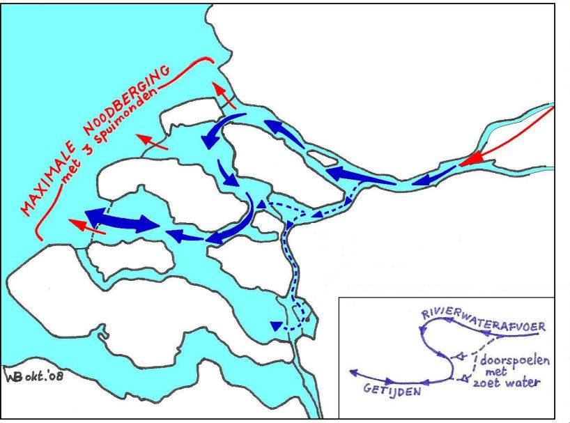 Middels een brede doorsteek bij de kop van Goeree kan het rivierwater via een grote S-bocht door de Grevelingen en de Oosterschelde naar zee stromen. Zo wordt het stroomtraject aanzienlijk verlengd. Na de noodzakelijke en hopelijk spoedig gerealiseerde afsluiting van de Nieuwe Waterweg stroomt het merendeel van het rivierwater straks door de zuidwestelijke delta. Hierdoor kan de estuariene dynamiek volledig terugkeren. Het ontstane estuarium fungeert als kraamkamer voor vis en verhoogt de productie van schelpdieren. Dit in combinatie met het behoud van de zoetwatervoorraden van het Haringvliet en het Volkerak-Zoommeer. Bij wisselende afvoeren kunnen onder meer de Haringvlietsluizen regulerend werken ten gunste van ecologie en veiligheid. Op het overzichtskaartje is de reguliere stroming in blauw aangegeven en met rood de noodafvoer bij extreem hoge rivierafvoeren. De noodberging omvat hierbij alle deltawateren, behalve de Westerschelde.